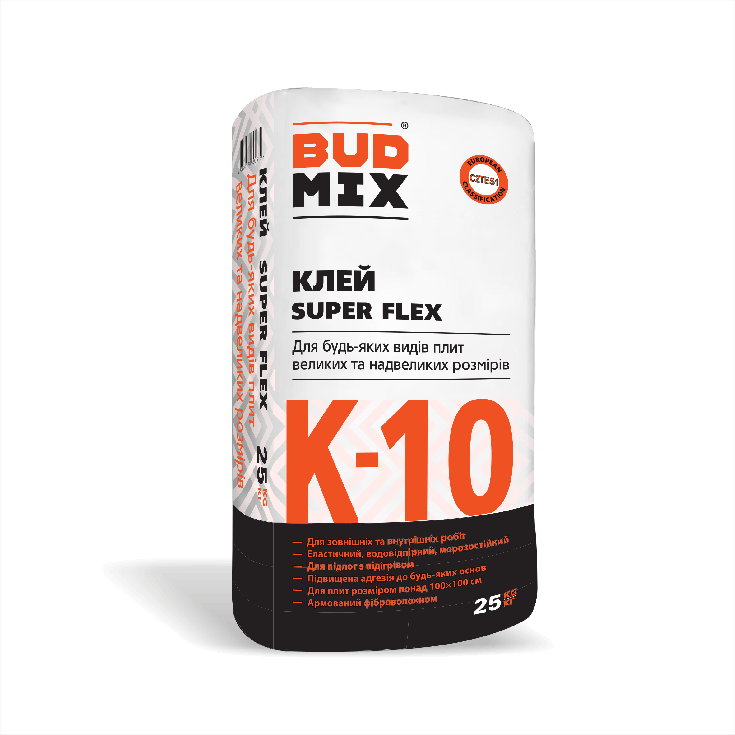 Клей для плитки BUDMIX К-10 SUPER FLEX 25кг – цементно-піщана суміш з наповнювачами та модифікаторами для приклеювання будь-яких видів оздоблювальних матеріалів: керамічної плитки, керамограніту, мозаїки, ґресу, плит надвеликих розмірів, декоративного каменю.Характеристики: