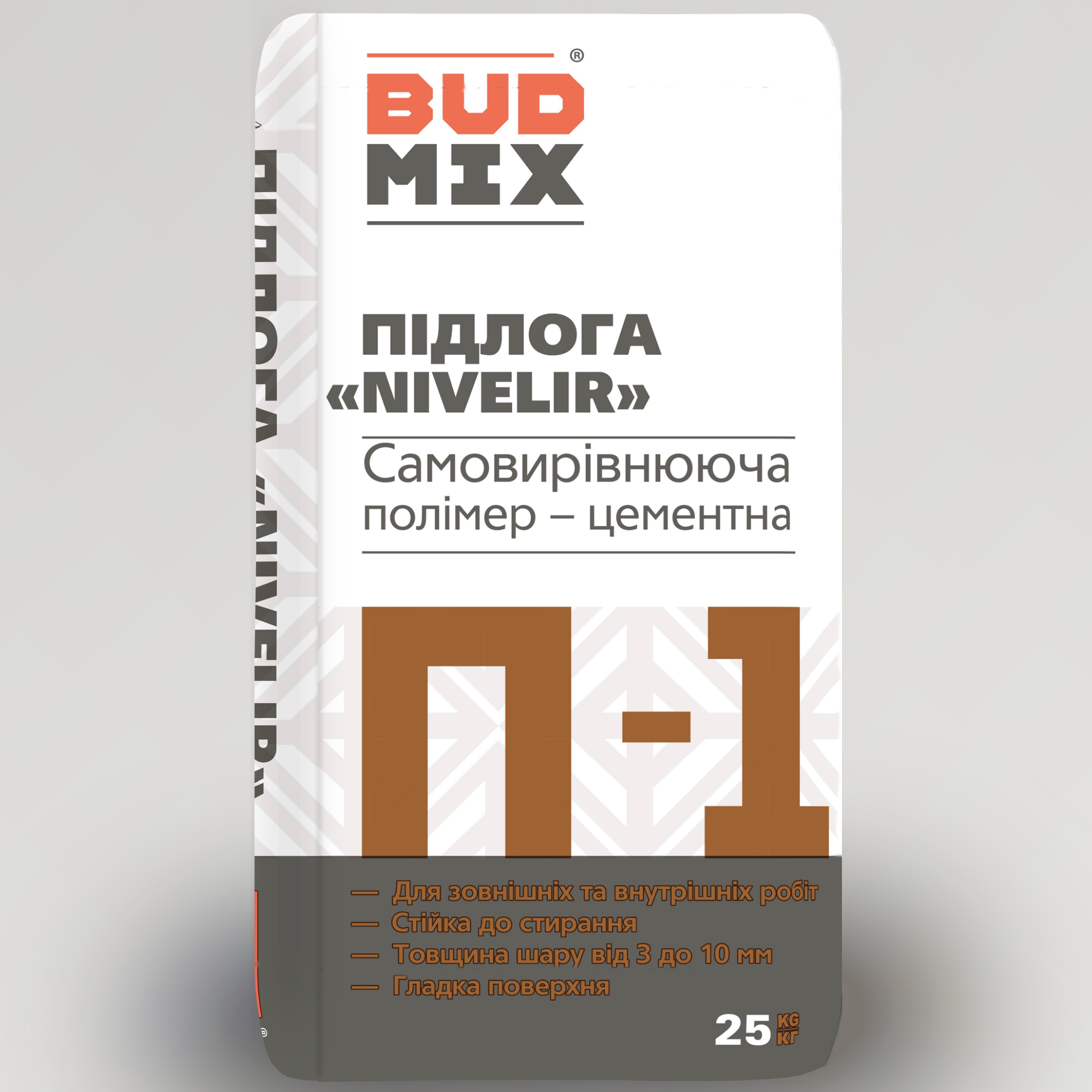 Самовирівнююча суміш для підлоги BUDMIX П-1 НІВЕЛІР 25кг – самовирівнююча суміш на основі цементу з інертними неорганічними наповнювачами та полімерними модифікаторами для вирівнювання горизонтальних основ під різноманітні покриття — плитку, паркет, лінолеум, ковролін, ламінат тощо.