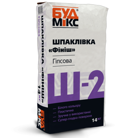 Шпаклівка фінішна BUDMIX Ш-2 ФІНІШ гіпсова 14кг – гіпсова суміш з наповнювачами та модифікаторами для фінішного вирівнювання бетонних та поштукатурених поверхонь, гіпсокартонних листів. Для внутрішніх робіт.Характеристики: