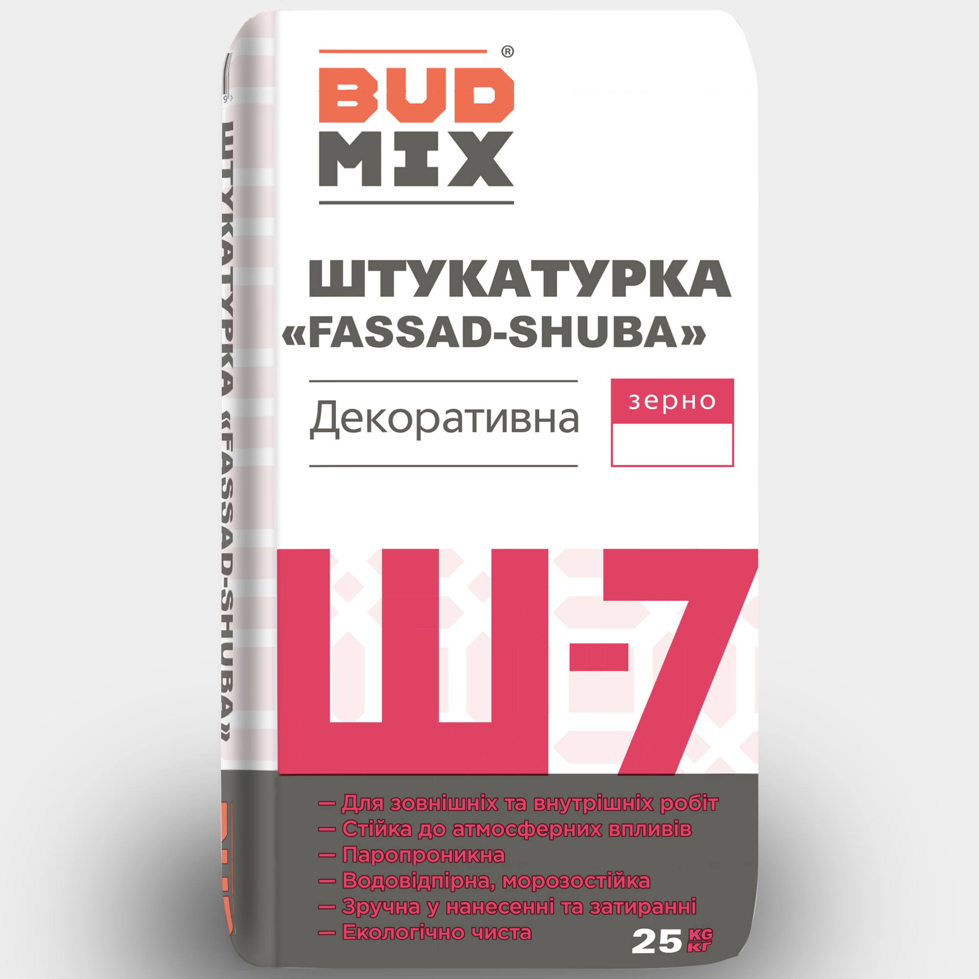 Декоративна штукатурка BUDMIX Ш-7 ШУБА Преміум 25кг – штукатурка на основі білого цементу з інертними неорганічними наповнювачами. Покращена формула. Сніжно - білого кольору з полімерними модифікованими для створення декоративної фактури типу «Шуба» по бетонних, цементно-піщаних, цементно-вапняних поверхнях, а також по армованих шарах в системах утеплення фасадів. Фракція зерна 1,5 або 2,0мм